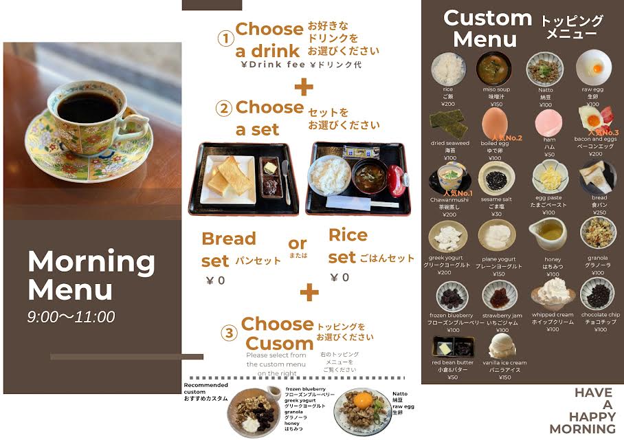 朝御膳とモーニングトッピング(Custom Menu)・ドリンクのみのご提供です。