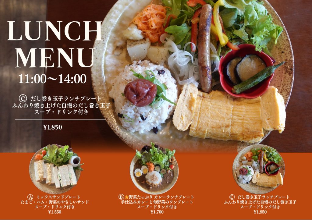 スープ・ドリンク付きランチプレート 3種類よりお選びください。11:00より注文可能です。